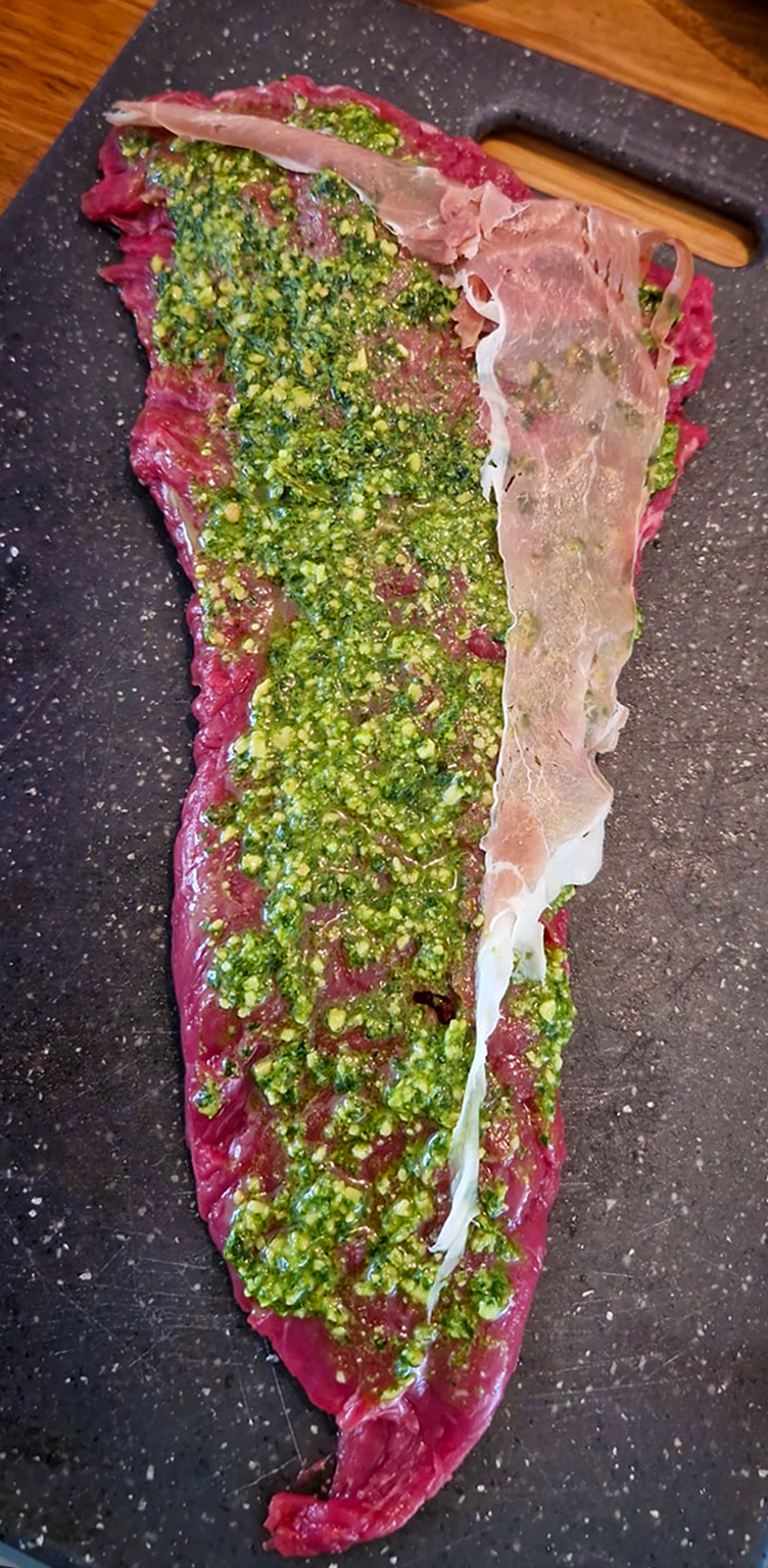 Maak de BBQ klaar voor indirect gebruik en stook deze op tot 140 graden. In de tussentijd maak je de bavette klaar: rol de bavette open en check of er stukken overmatig vet zijn. Snij deze weg. Smeer de bavette ruim in met de verse pesto. Hier bovenop verdeel je de prosciutto, gevolgd door de baby spinazie. Strooi de Parmezaanse kaassnippers er overheen en verdeel de pijnboompitten over het geheel. Rol de bavette met de ingrediënten vervolgens op en knoop deze af (als een rollade).